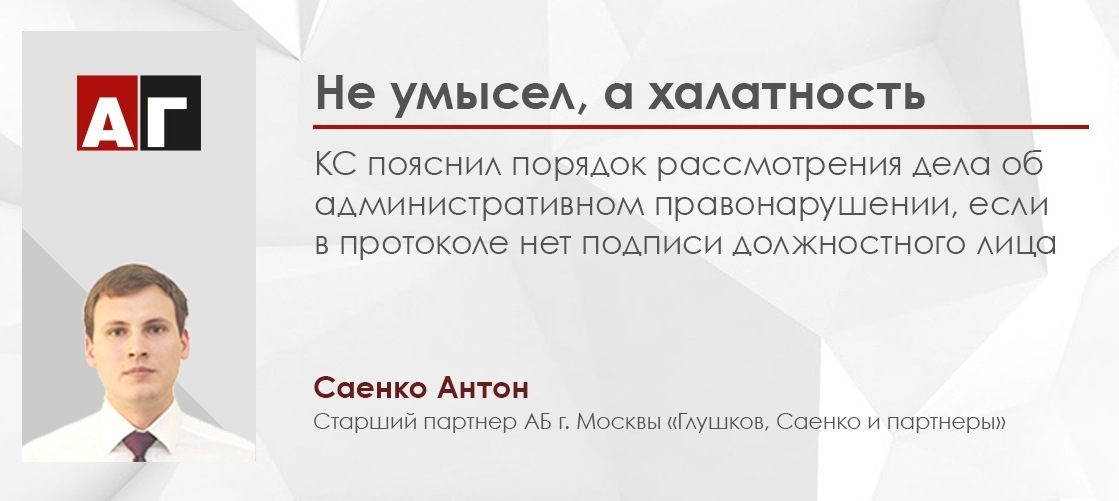 Конституционный Суд Постановлением от 3 октября 2024 г. № 43-П пояснил процедуру рассмотрения дела при отсутствии в протоколе об административном правонарушении подписи составившего его должностного лица. Так, Суд заметил, что отсутствие в протоколе подписи составившего его лица обусловливается, как правило, халатностью, а не преднамеренным характером действий и не свидетельствует о том, что обстоятельства правонарушения фактически отсутствовали.